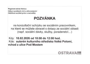 Konzultační schůzka se sociální pracovnicí Magistrátu města Ostravy proběhne ve středu 18. února od 10 do 12 hodin v suterénu Kulturního střediska, vchod z ulice Pod Mostem.