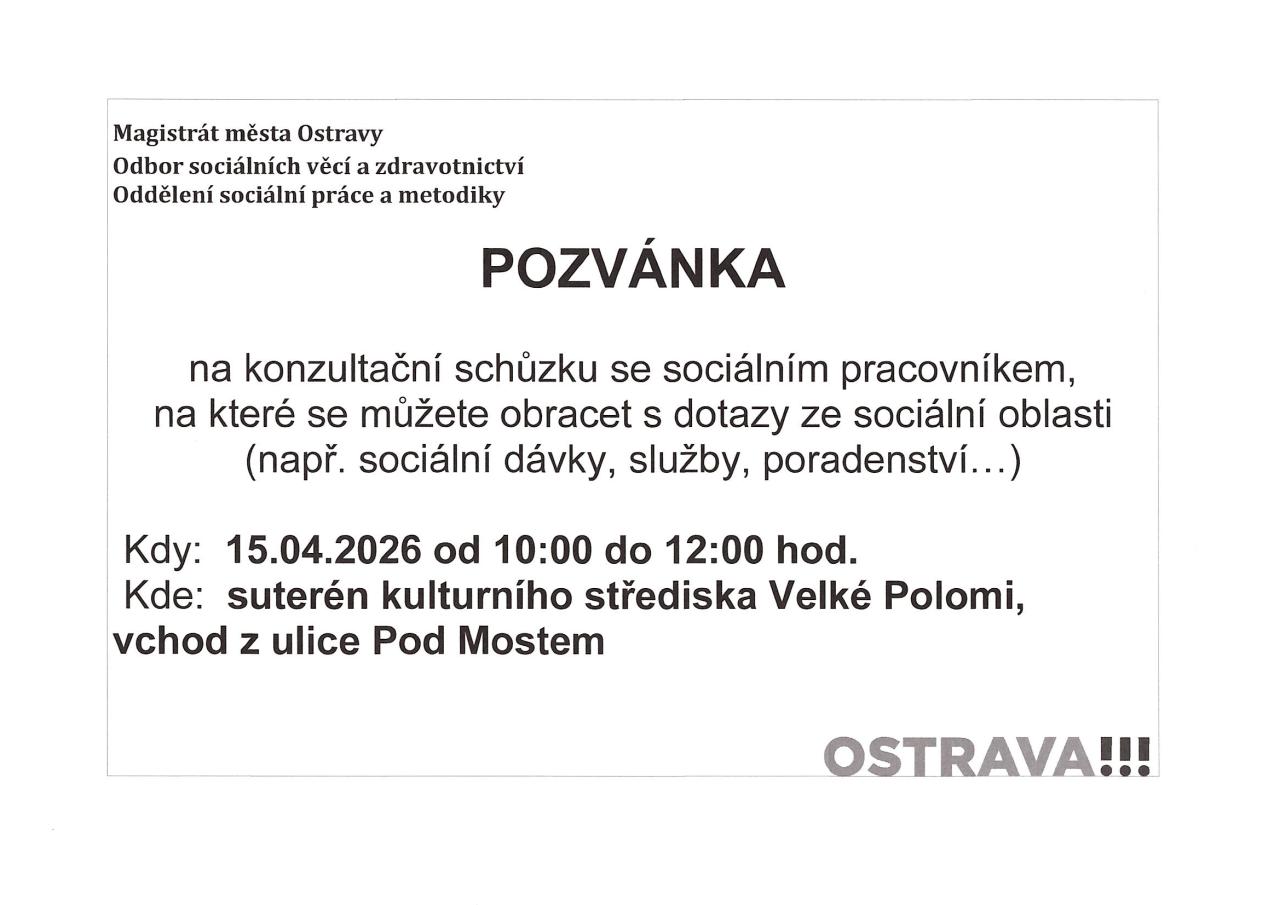 Konzultační schůzka se sociální pracovnicí Magistrátu města Ostravy proběhne ve středu 15. dubna od 10 do 12 hodin v suterénu Kulturního střediska, vchod z ulice Pod Mostem.